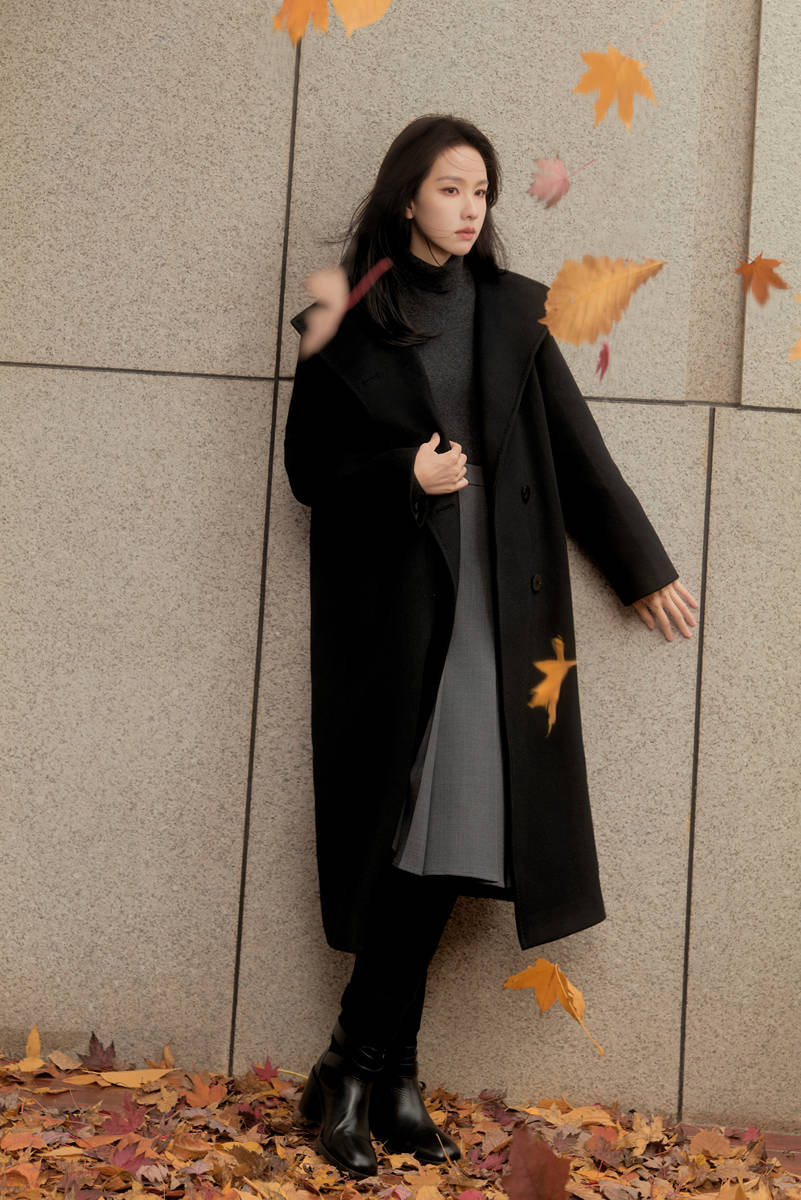造型的质感,更藏在细节的打磨中。大衣面料看似简约,实则带着细腻的暗纹,在自然光下会泛出柔和光泽,避免了纯黑的沉闷;长裙的面料柔软亲肤,行走时裙摆轻扬,与大衣下摆的垂坠感形成动静呼应。妆容上的“克制”同样契合这份哲学,她以通透底妆保留肌肤原生质感,浅棕眼影自然晕染,裸粉色唇妆贴近本身唇色,仅用淡淡的腮红提升气色,这种“伪素颜”状态与秋日的静谧氛围相得益彰,让气质成为最好的“妆容”。