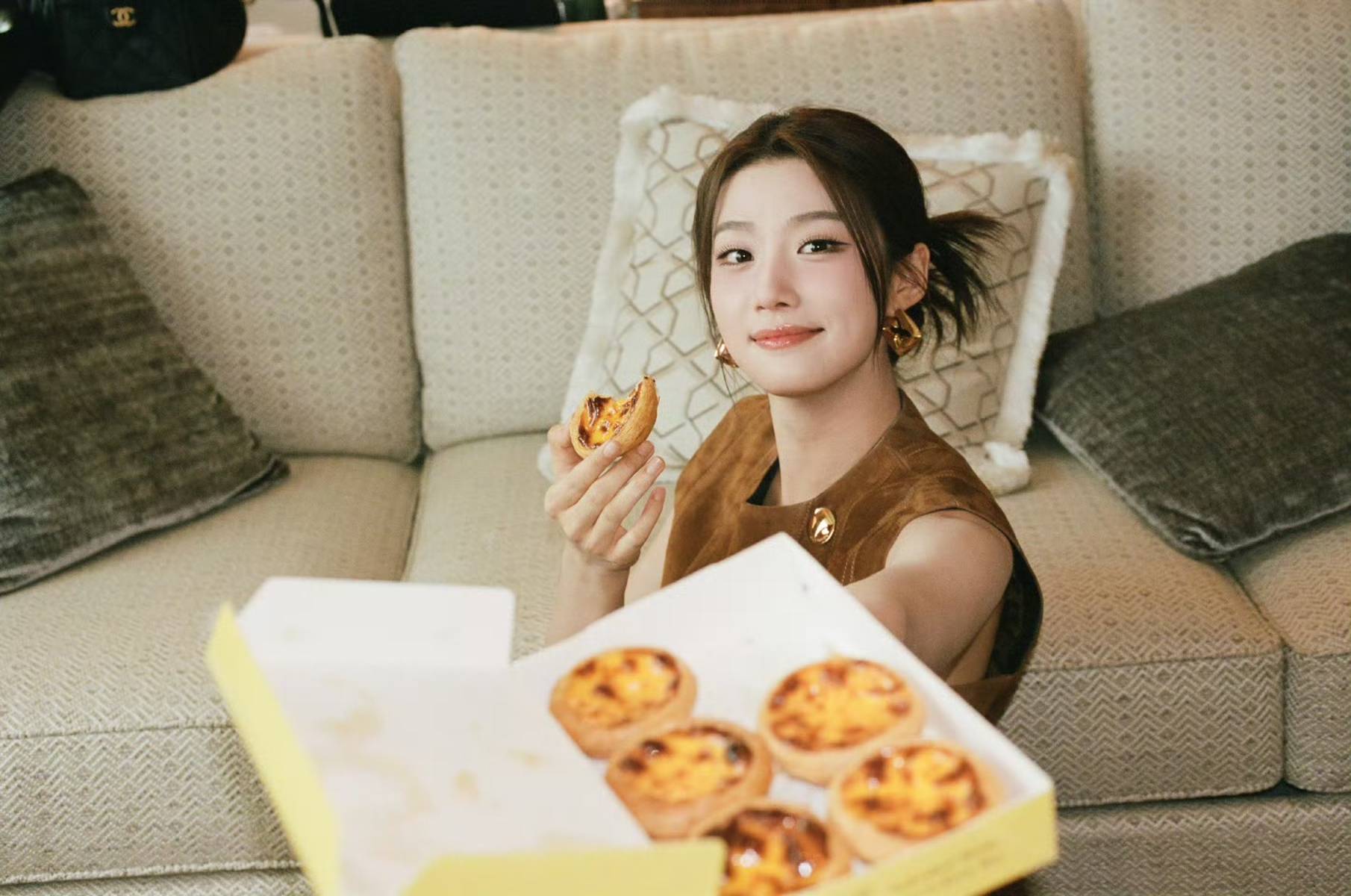“手拿蛋挞”的造型堪称这组写真的点睛之笔,也让卢昱晓的俏皮特质展现得淋漓尽致。在街角的烘焙店前,她单手捧着刚出炉的蛋挞,另一只手轻轻捏起蛋挞边缘,似乎正准备品尝这份甜蜜。蛋挞金黄的外皮与她身上的米白色连衣裙形成温暖的色彩呼应,嘴角不自觉扬起的弧度,让笑容里都透着蛋挞的香甜。最动人的是她的微表情——微微鼓起的脸颊与闪烁着笑意的眼神,将少女面对美食时的欣喜与灵动精准传递,这种不加修饰的自然状态,远比刻意摆拍的造型更具感染力。