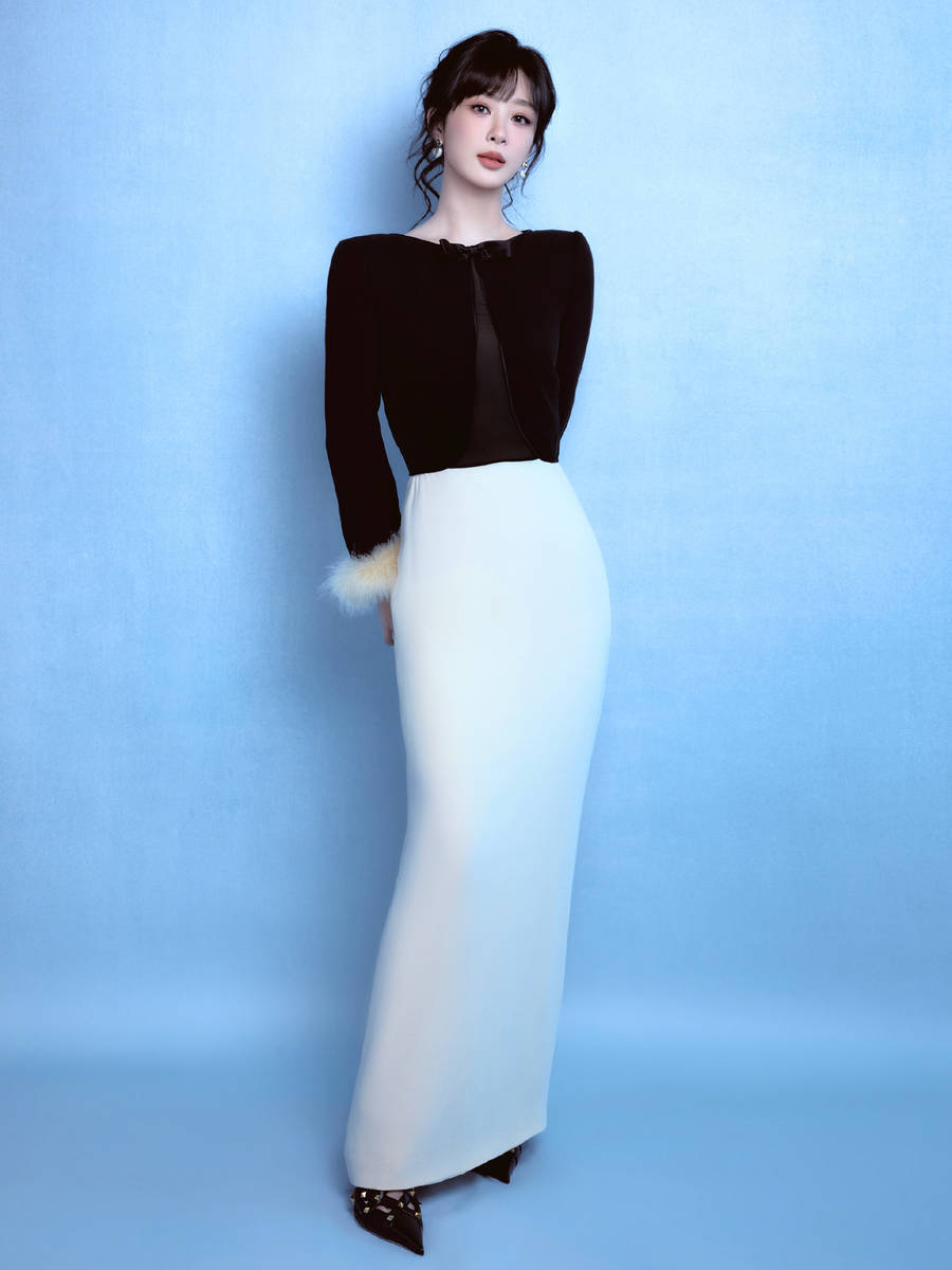 这组造型写真的拍摄风格极具氛围感,背景选用简约的深色幕布,将焦点完全集中在杨紫身上。礼裙的黑白拼色设计十分巧妙,上半部分的黑色采用立体剪裁,贴合身形却不紧绷,展现出流畅的肩部线条;让她在行走时宛如一只优雅的黑天鹅。